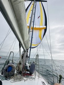 Parasailor runter, Genua mit einem Reff rauf. Das war in dieser Situation erstmal viel sicherer. Unten erstmal Schadensbegrenzung. Alle Handtücher verteilt und das Frühstücks-Müsli vom Boden gekratzt.