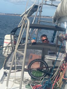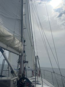 Zwei Stunden volle Konzentration und mit der eigentlichen Segel-Arbeit, dem Setzen und Trimmen der Segel hatte ich erstmal gar nichts zu tun – NUR Steuerwache. Puuuuhhhh, da kommt Arbeit auf Jörg zu. Die ganzen Segel-Ausdrücke sitzen noch nicht richtig. Jörg ruft „Abfallen, Abfallen“ – ich denke, was war das noch gleich? Ach ja, das Schiff aus dem Wind drehen. Oh Mann.