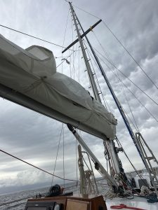 Nun gut, jetzt aber wirklich los. Segel gesetzt und in Richtung Ost Nordost. Nachmittags frischt der Wind dann ordentlich auf und wir haben alle Hände voll zu tun, Segel zu wechseln, zu reffen, Leinen zu tauschen, Bullenstander für das Großsegel zu tauschen, Seiten zu wechseln.