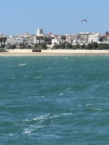 Gestern sind wir nun in Rota angekommen. 19 Seemeilen, ein Klacks, 5 Stunden. Da das Wetter in den nächsten Tagen nicht besonders „Gibraltar tauglich“ vorhergesagt war, wollten wir einige Tage Station machen. Rota und Cádiz anschauen. Also, hatten wir vorab die Marina gebucht. Unterwegs, ab mittags wurde allerdings der Wind immer ruppiger, irgendwann über 28 Knoten. Losgefahren, lustig mit Genua und Groß, konnten wir gar nicht so schnell, erst die Genua gegen die Fock tauschen, 1., 2., 3. Reff in‘s Groß Segel. Fock gerefft, dann Fock und Groß ganz weg und Motor an. Der Wind kam genau von vorne und so hart am Wind wollte ich nicht.