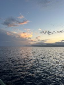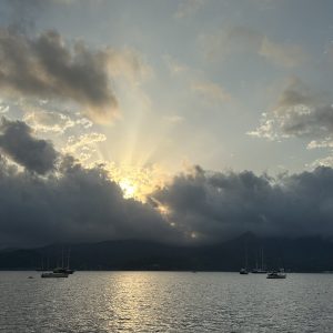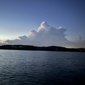 Wir sind trotz Regenjacken bis auf die Haut nass und frieren. Ich geh kurz runter, um mir andere Regenklamotten anzuziehen. Plötzlich ein ohrenbetäubender Knall. Ich rase an Deck und frage Jörg, was passiert ist. Es hat ein Blitz 10 Meter neben dem Schiff ins Wasser eingeschlagen. Wow, selbst beim Aufschreiben schlägt mir das Herz noch bis zum Hals.